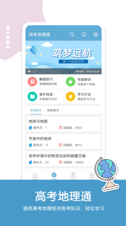 对文科生们来说,这款软件绝对是能给地理成绩来一针强心剂的软件,在软件里不仅按照地理课本划分了知识点,还有专题精讲,并且还延伸了很多课外的地理知识来帮助大家理解知识点,对地理知识大有裨益。