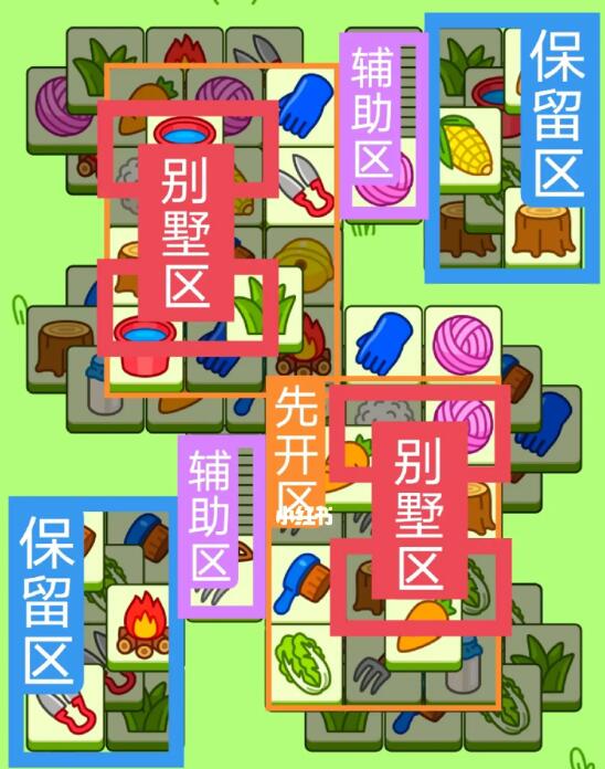 两个工字型大别墅,开局先消除橙色区,然后按照一层层均匀消除表面牌,哪里压牌比较多就先消除哪里,必要时可以用盲盒区辅助消除表面牌,尽量还是必别墅区内互相消除为主,蓝色区有叠牌,但是不多,全部保留到后期使用。