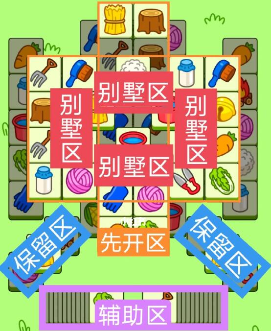2.开局先消除橙色区的牌,这里压牌。尽量要让牌面保持在同一水平面,然后一层一层消除表面牌,不要跨层太多拿牌,等表面牌消除完后,以大别墅内互相消除为主。