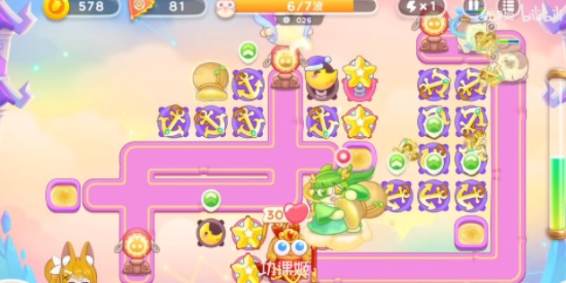 2、先把右侧区域的道具都贵妃打掉,放船锚炮就可以,靠萝卜的位置多放几个星星塔,第二波就会有飞飞兔,然后往左下角清理,先把那个大钟打掉,然后在上面起点的边上放船锚炮往左侧清理,先把起点附近的道具打掉;