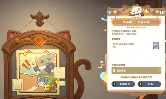 1、活动期间自行前往猫尾酒馆的邀请板处,参与「七圣召唤」热斗模式:万能向导。