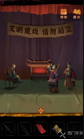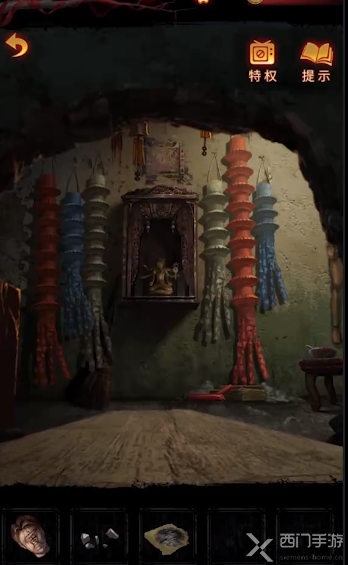 3、在下方墙洞处观察屋内各种颜色的灵幡,铺上木板之后,将碎石块砸向神龛的葬老六,可以获取钥匙;