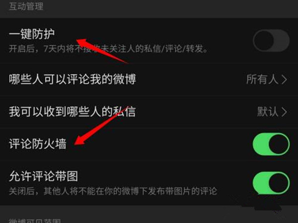 在隐私设置中,将评论防火墙和一键防护选项后面的开关全部关闭即可。