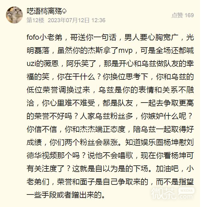 fofo小老弟,哥送你一句话,男人要心胸宽广,光明磊落,虽然你的杰斯拿了mvp,可是全场还都喊uzi的薇恩,阿乐笑了,那是开心和乌兹做队友的幸福的笑,你在干什么?你换位思考下,你和乌兹的低位荣誉调换过来,乌兹是你的表情和关系不融洽,你心里难不难受,都是队友,一起去争取更高的荣誉不好吗?人家乌兹粉丝多,你嫉妒什么呢?你信不信,你和杰杰端正态度,陪乌兹一起取得好成绩,你们两个粉丝会暴涨。知道娱乐圈杨坤慰刘德华视频那个吗?说他不会唱歌,现在你看杨坤可有关注度了?这就是自以为是的下场。加油吧,小老弟们,荣誉和面子是自己争取来的,而不是指望一些手段或者蹭出来的。