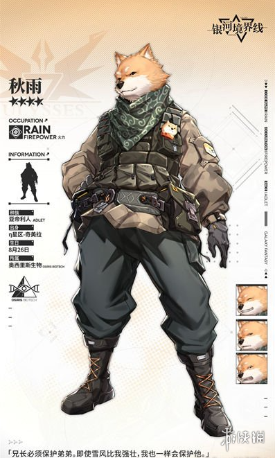 秋雨虽然在银河境界线当中是一个四星的角色,但是他的强度可不弱,秋雨是一个定位在火力的特勤,亚帝利国的人,秋雨身处于奥西里斯生物这个阵营当中,背景故事得知秋雨有个弟弟,保护弟弟是秋雨身为兄长的责任。
