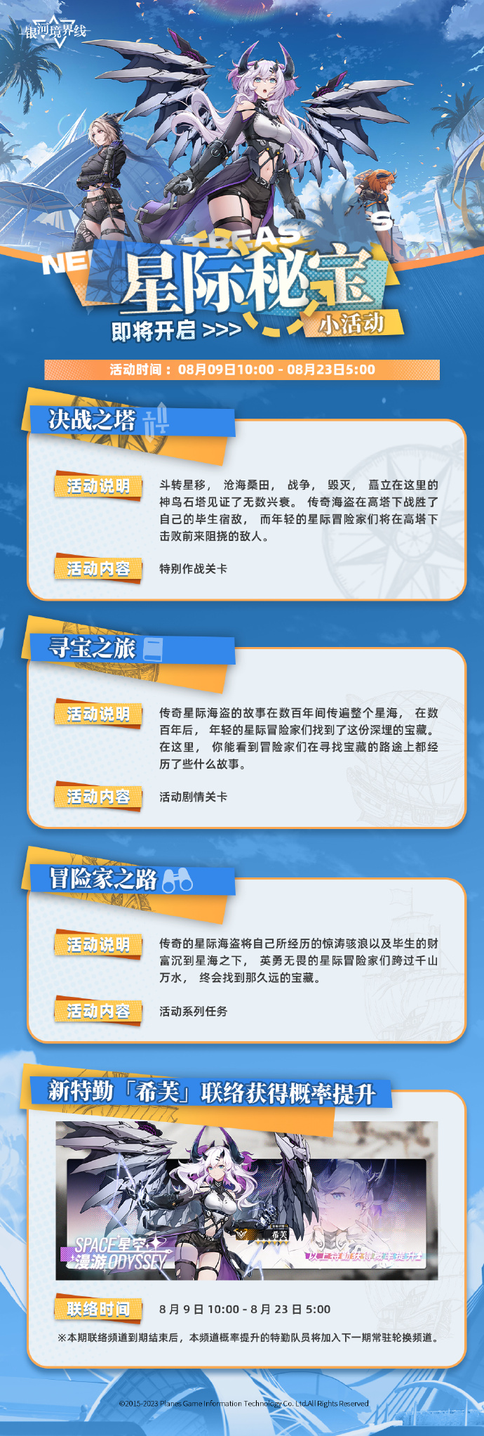 活动说明:传奇的星际海盗将自己所经历的惊涛骇浪以及毕生的财富沉到星海之下,英勇无畏的星际冒险家们跨过千山万水,终会找到那久远的宝藏。