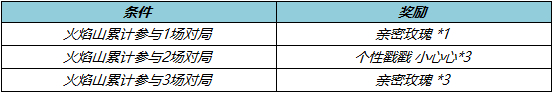 火焰山大乱斗,全面升级上线!活动期间累计完成火焰山对局,得亲密玫瑰、个性戳戳 小心心!