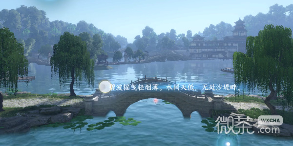 2、进入游戏作词画面视野来到西湖苏堤上空,以苏堤为意象作词(碧波摇曳轻烟薄。水阔天低,无处沙堤畔。)。