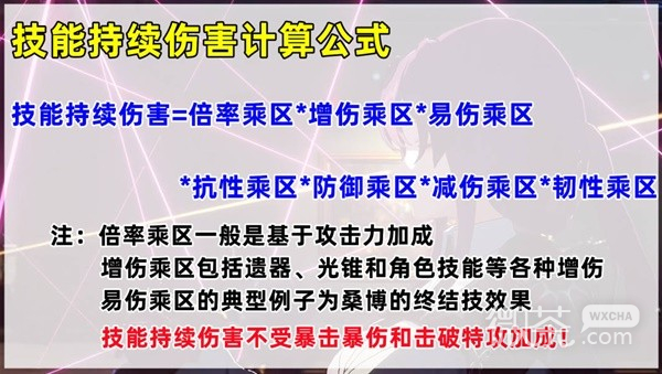 简单来说,技能持续伤害就是由技能触发的触电、风化、裂伤或者灼烧,可以粗略理解为不会暴击的另一种技能伤害。计算公式为:技能持续伤害=倍率乘区*增伤乘区*易伤乘区*抗性乘区*防御乘区*减伤乘区*韧性乘区。