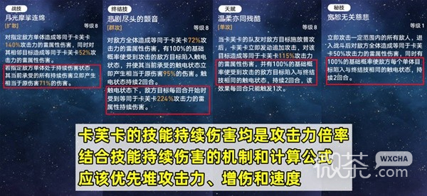 通过公式可以得知,技能持续伤害不受双暴和击破特攻加成。想要让一名角色的技能持续伤害更高,培养时应该优先考虑倍率乘区和增伤乘区。卡芙卡的所有持续伤害倍率都是基于攻击力加成,所以选择遗器和光锥时,应该优先堆攻击力和增伤;另外还需要堆点速度,让卡芙卡有更多释放技能、从而引爆持续伤害的机会。