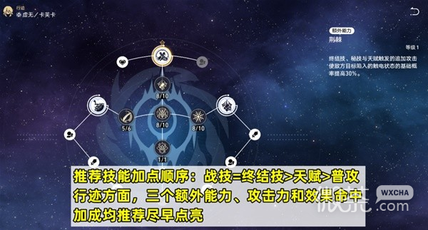 推荐技能加点顺序为:战技=终结技>天赋>普攻。因为战技经常使用,而天赋的触电伤害是基于终结技的倍率,所以推荐先升战技和终结技,再升天赋。行迹方面,三个额外能力、后续分支的攻击力和效果命中加成,均推荐尽早点亮。