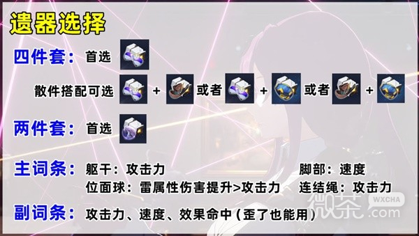 词条方面,主词条推荐:躯干选攻击力,脚部选速度,位面球首选雷属性伤害提升,次选攻击力,连结绳选攻击力。副词条优先找攻击力和速度即可,如果歪了效果命中也能用。