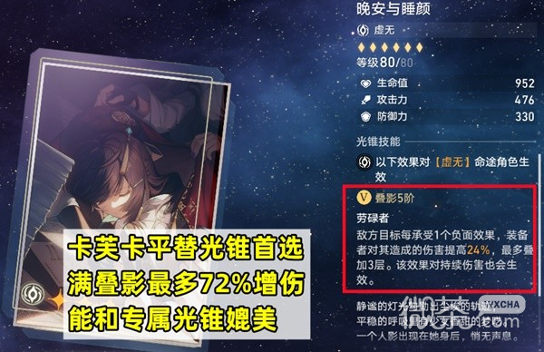 正如前面分析的,卡芙卡不太需要效果命中,更需要增伤、速度和攻击力,因此光锥首选专属光锥只需等待,兼具增伤、速度提升以及额外的触电手段。平替光锥首选晚安与睡颜,叠影越高越好,满叠影最多可提供72%的增伤,能和专属光锥媲美。