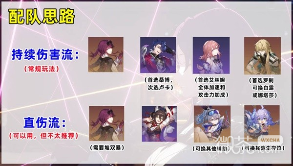 目前卡芙卡的配队思路有两种,第一种是常规的持续伤害流,推荐配队为:卡芙卡+桑博+艾丝妲+罗刹。这个配队里,主C自然是卡芙卡。副C首选桑博,他的技能机制跟卡芙卡更加搭配;次选卢卡,不推荐希露瓦。辅助首选艾丝妲,有全体加速和攻击力加成,普攻还有概率附带灼烧。生存位首选罗刹,替代可选白露或娜塔莎。