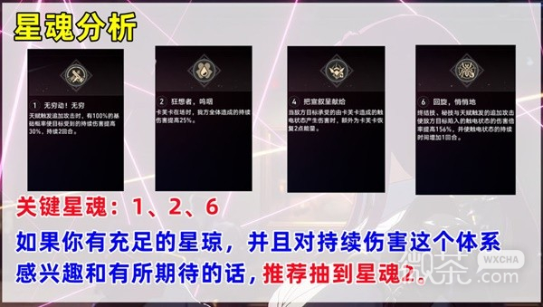 卡芙卡0星魂就已经机制完整,而提升比较大的是星魂1、2和6。如果你有充足的星琼,并且对持续伤害这个体系感兴趣和有所期待的话,推荐抽到星魂2。