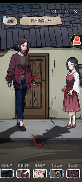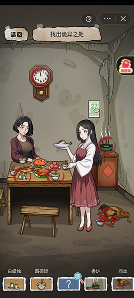 1、玩家要找到诡异的地方,点击桌子上的四碗饭、墙上的特殊日期、香炉、鸡血、时钟、蜡烛;