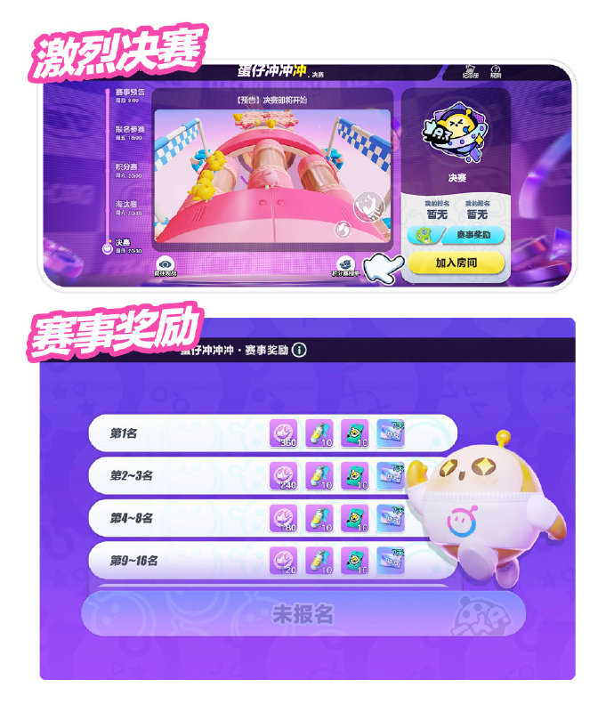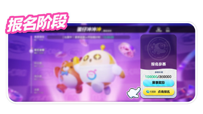 每周五18:00;19:00;20:00,赛事报名将错峰开启,在三个时段各有12万个名额,5级以上且达鹅蛋及以上蛋位的蛋仔,成功报名即可获取专属参赛卡~