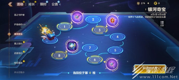 在活动界面消耗100点券购买银河积分礼包,每次消耗1枚银河积分,小飞吉将随机前进,小飞吉将随机前进1、2、3、4、8步,前进满8步达到终点后将不再前进,小飞吉每前进一步,都可解锁对应奖励~
