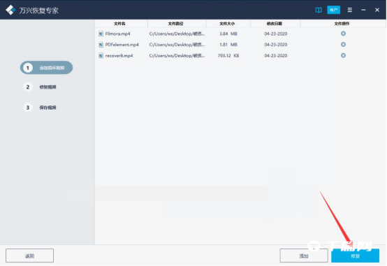 4、然后,点击界面右下方的“修复”按钮,万兴恢复专家便开始修复破损视频。
