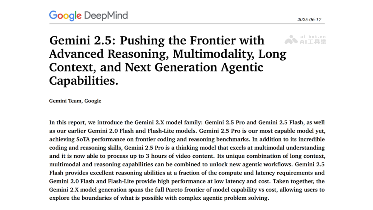 谷歌Gemini2.5模型技术白皮书详细介绍Google DeepMind最新多模态AI家族,包括Gemini2.5 Pro和Flash两大核心版本。Gemini2.5 Pro支持100万token长上下文处理与3小时视频分析,在推理编码和多模态理解方面表现卓越;Flash版本则以低延迟高性能著称。白皮书涵盖模型架构、训练方法、安全性优化及代码生成、教育工具等实际应用案例,展现其强大的代理能力和技术突破。