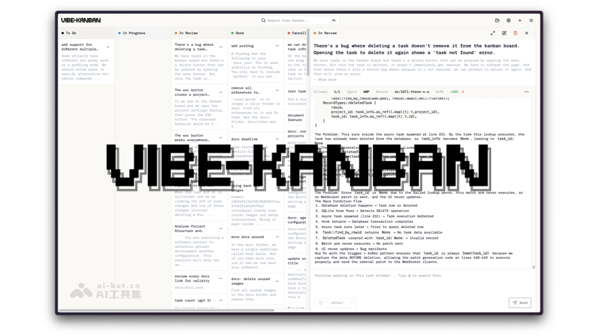 VibeKanban是一款开源AI编程Agent任务管理工具,专为开发者设计。它通过可视化看板高效管理Claude Code、Gemini CLI等AI编码代理,支持任务编排与实时状态跟踪。提供集中配置管理和远程SSH访问功能,可与VS Code等工具集成,实现多任务并行开发和团队协作,显著提升开发效率和项目管理体验。